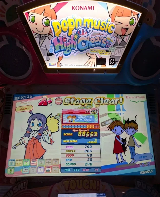 ポップンはピカピカポップ君モデルが登場しました。ボタンが軽いのと液晶の改善が効いてかなりスコアが出るようになりました。今までの新筐体(通称:ボロボロポップ君モデル)では全くスコアが出なくて、なんならブラウン管の旧筐体(通称:シン・ボロボロポップ君モデル)のほうがスコアが出るぐらいだったのですが、ピポ君モはかなり好印象です。欠点はまだ設置店舗と台数が少ないところですね。(このボロボロ等の呼び方はある方の受け売りで勝手に使っていますw)